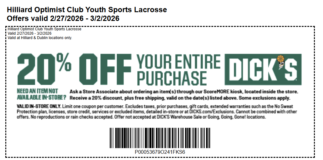 Hilliard Optimist Youth Lacrosse is to develop athletic and academic skills through sports participation and academic competition, which strengthen inner core values and principles, encourage abilities in leadership, fair play and teamwork, and provide fun, rewarding and memorable growing experiences. If you have questions, please email